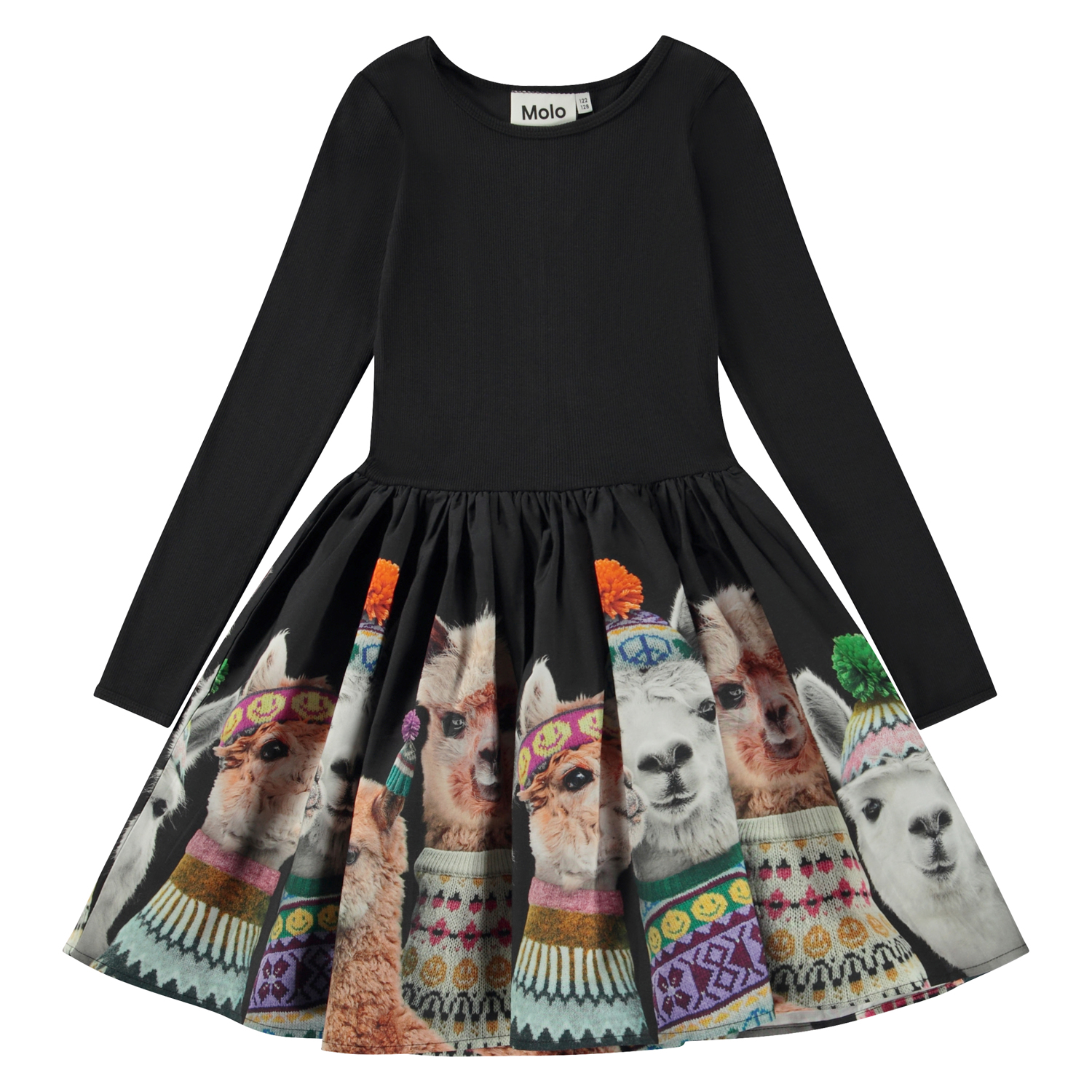 Sort knælang kjole med rundskåret poplin skørt med print. Printet består af søde og sjove Lhamaer, der er fulde af humor. De har fået Molo’s egen strikstyles på og har pakket sig godt ind i hatte, halsedisser og sweatre. Denne kjole er fremstillet i 100% bomuld, har rund halsudskæring med smal ribkant, lange ærmer, poplinskørt med print, samt et regulært fit.