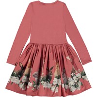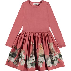 Rosa knælang kjole med rundskåret poplin skørt med print. Printet består af små kaniner, der hygger sig blandt en masse blomster. Denne kjole er fremstillet i 100% bomuld, har rund halsudskæring med smal ribkant, lange ærmer, poplinskørt med print, samt et regulært fit.