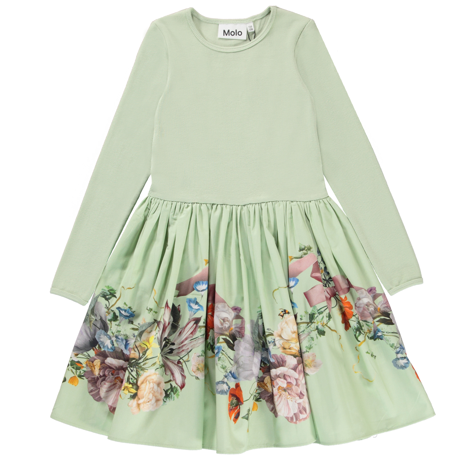 Casie er en mint grøn kjole med overdel i rib, lange ærmer, samt et feminint poplin skørt med print af flotte store blomster.