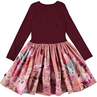 Casie er en to-delt kjole med mørkerød ribbet overdel med lange ærmer og skørt med printet 'Greetings', som er blomster buketter med små hilsener