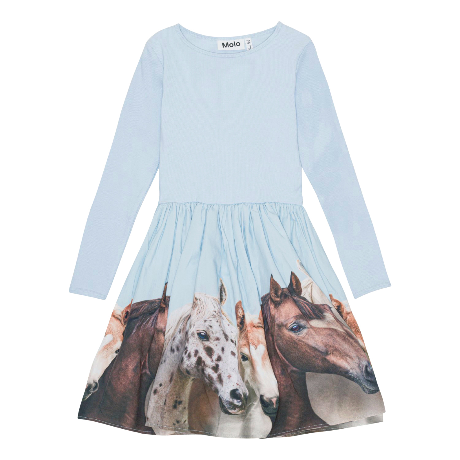 Langærmet lyseblå kjole med rundskåret skørt i økologisk bomuld. Toppen er tætsiddende i ribbet jersey, der gør den nem at komme i og behagelig at have på. Skørtet er i en bomulds poplin, og har et print af heste i brune og hvide nuancer, der følger skørtet rundt.