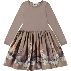 Gråbrun knælang kjole med rundskåret poplin skørt med print. Printet består af små kaniner, der hygger sig blandt en masse blomster. Denne kjole er fremstillet i 100% bomuld, har rund halsudskæring med smal ribkant, lange ærmer, poplinskørt med print, samt et regulært fit.