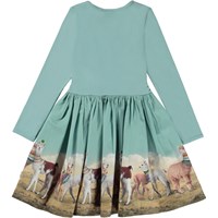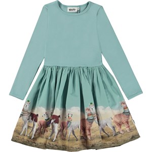 Lyseblå knælang kjole med rundskåret poplin skørt med print. Printet består af søde og sjove Lhamaer, der er fulde af humor. De har fået Molo’s egen strikstyles på og har pakket sig godt ind i hatte, halsedisser og sweatre. Denne kjole er fremstillet i 100% bomuld, har rund halsudskæring med smal ribkant, lange ærmer, poplinskørt med print, samt et regulært fit.
