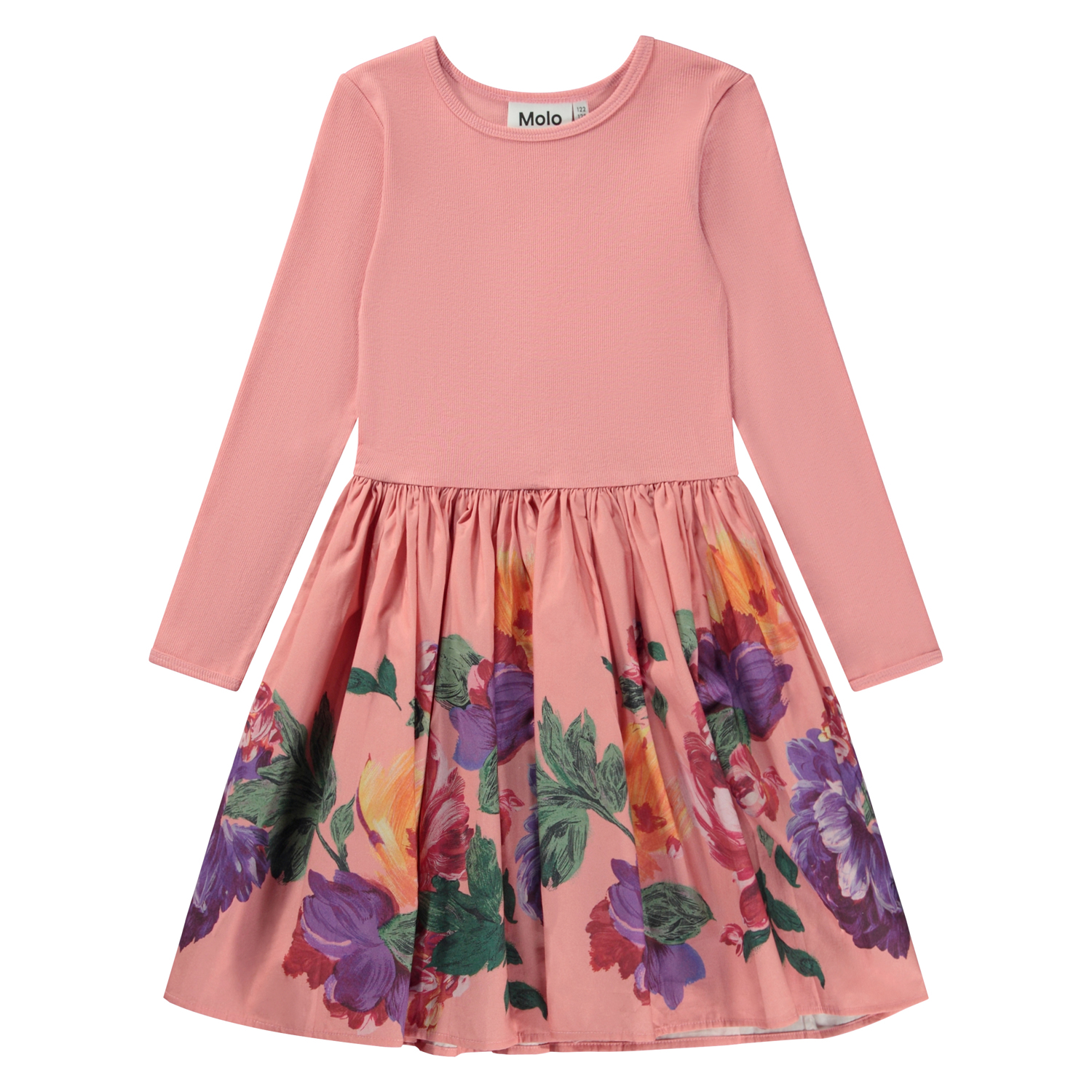 Pink knælang kjole med rundskåret poplin skørt med print. Printet er dannet af smukke, håndmalede blomster og hvis du kigger efter, kan du se penselstrøgne. Denne kjole er fremstillet i 100% bomuld, har rund halsudskæring med smal ribkant, lange ærmer, poplinskørt med print, samt et regulært fit.