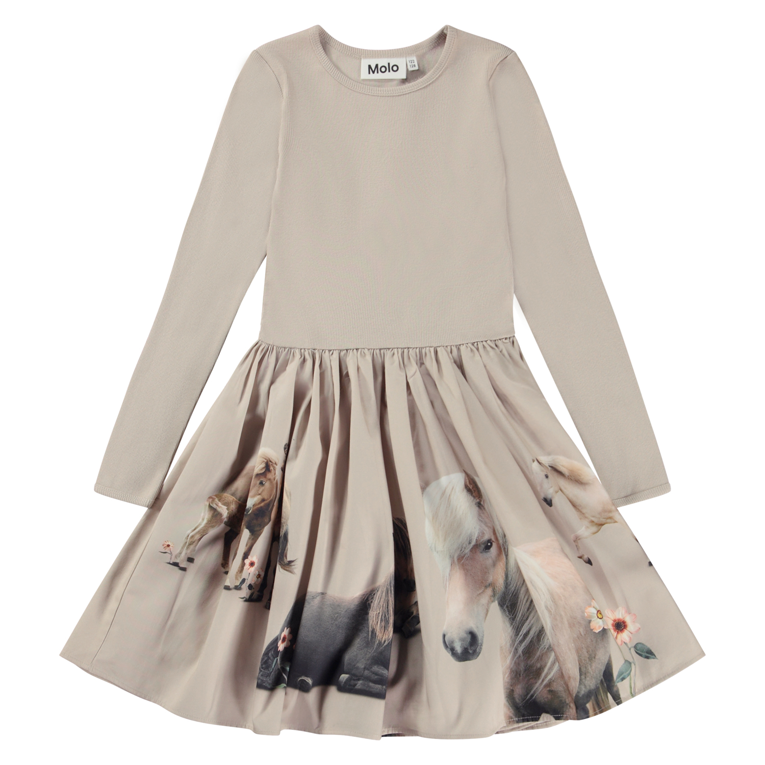 Beige knælang kjole med rundskåret poplin skørt med print.Printet består af en familie af søde ponyer, der enten står, løber eller tager sig en slapper. Denne kjole er fremstillet i 100% bomuld, har rund halsudskæring med smal ribkant, lange ærmer, poplinskørt med print, samt et regulært fit.