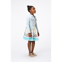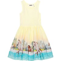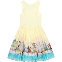 Pastel gul stropkjole med rundskåret skørt i økologisk bomuld. Toppen er i ribbet jersey, og er tætsiddende mens skørtet er i bomuldspoplin med et print af en smuk Bounty strand og galoperende heste.