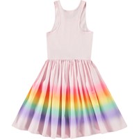 Lyserød kjole i økologisk bomuld med tætsiddende ribbet jerseytop og poplin skørt. Kjolen har en almindelig pasform med et regnbueprint på skørtet.