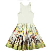 Råhvid kjole i økologisk bomuld med tætsiddende ribbet jerseytop og poplin skørt. Kjolen har en almindelig pasform med et farverigt print på skørtet af blomster og nuttede dyr på en græsmark.
