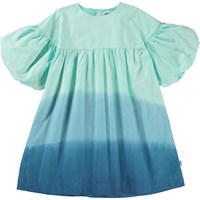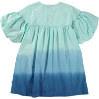 Catherine er en knælang voluminøs kjole i økologisk bomuld og blålige nuancer. Kjolen har et fast bærestykke, med pufærmer og dip dye print.