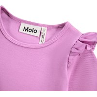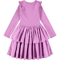Langærmet lilla kjole i økologisk bomuld med en tætsiddende ribbet jerseytop, rund hals, en lille flæse ved skuldrene samt et skørt i dobbeltlag bomuldspoplin, der tilføjer masser af fylde