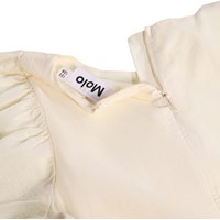 Råhvid kjole i blød, økologisk bomuld med elegant broderie anglaise ved ærmer og bund. Kjolen har et rundskåret, voluminøst skørt i let bomuldspoplin. Overdelen har bløde sommerfugleærmer, der falder let over skuldrene, samt en usynlig lynlås i nakken for nem på- og afklædning.