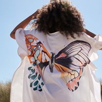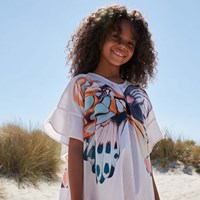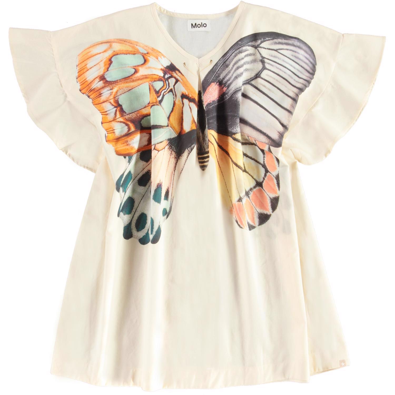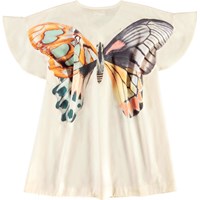 Smuk tunika med flæseærmer og smukt sommerfugleprint på en cremefarvet bund. Nem at iføre sig til en dag på stranden med badetøjet nedenunder. I 100% økologisk bomuld.