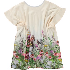 Let, cremefarvet tunika, med flæseærmer og placeret print fremstillet i 100% økologisk bomuld. På printet ses heste galopere igennem en smuk og vild blomstereng. Tunikaen er nem at iføre sig til en dag på stranden med badetøjet nedenunder.