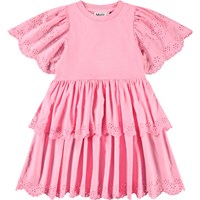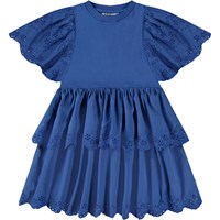 Blå knælang kjole i økologisk bomuld med rund hals og ribkant. Kjolen har en tætsiddende overdel i bomuldsjersey, sommerfugleærmer samt et skørt i to lag, med broderi anglaise både på skørtet og ærmerne.