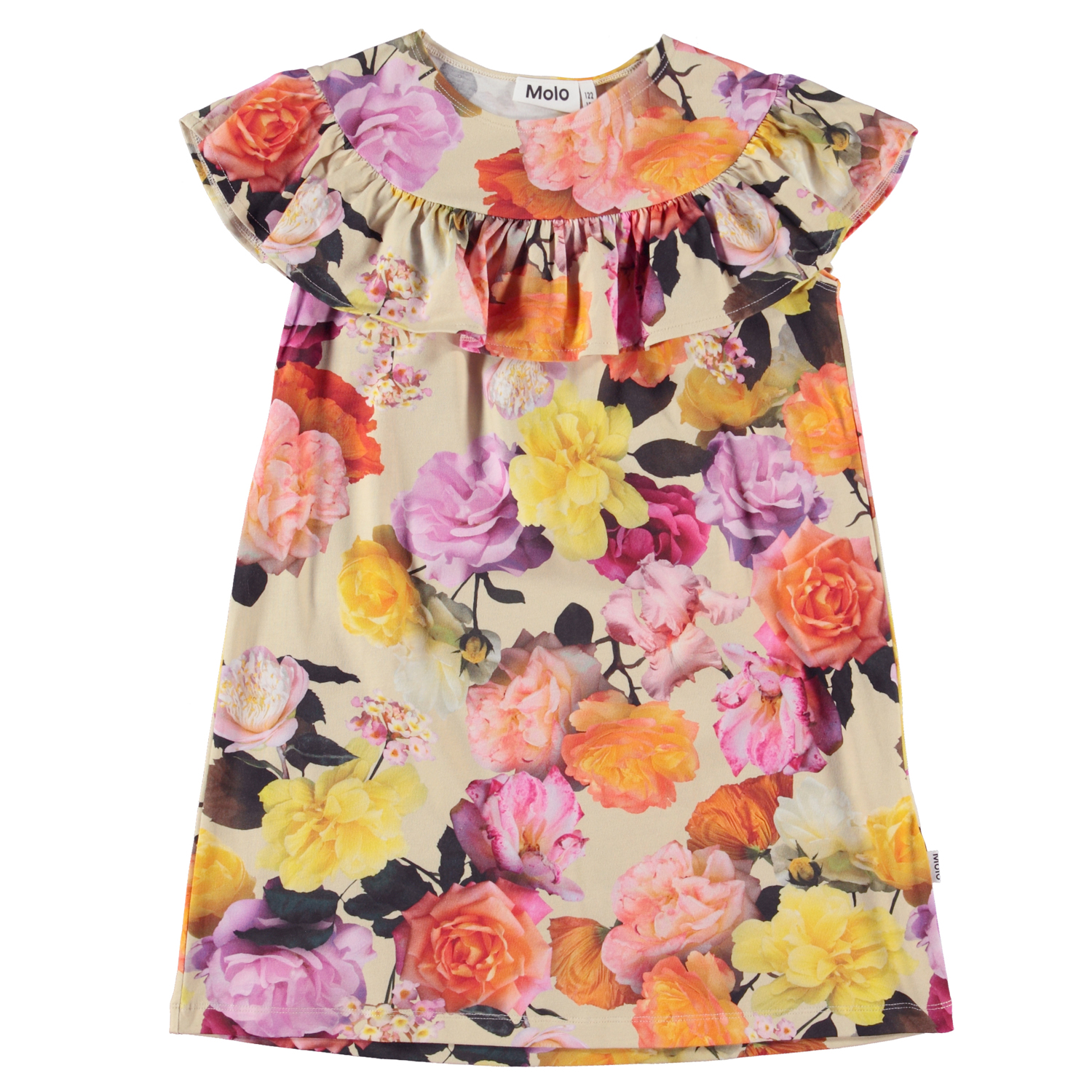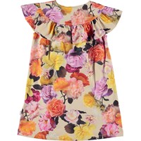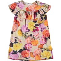 Celia er en kortærmet kjole i økologisk bomulds jersey. Kjolen har et bærestykke ved hals og skulder, med en påsat flæse, der går hele vejen rundt og som danner kjolens korte ærmer. Celia er i et allover multifarvet roseprint.