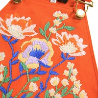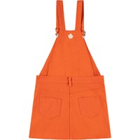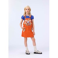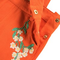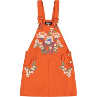 Orange bomuldskjole med justerbare stropper for en optimal pasform. Kjolen har et fast taljestykke med bæltestropper og praktiske trykknapper i siden, som gør den let at tage på. Den er dekoreret med smukke broderede blomster på brystet og ved lommerne, samt en lille broderet blomst i nakken.