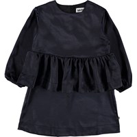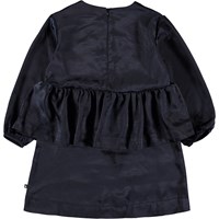 Charella er en mørkeblå kjole med lange ærmer og flot peplum skørt.