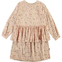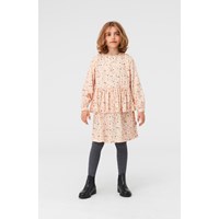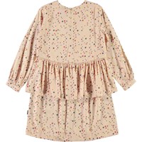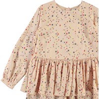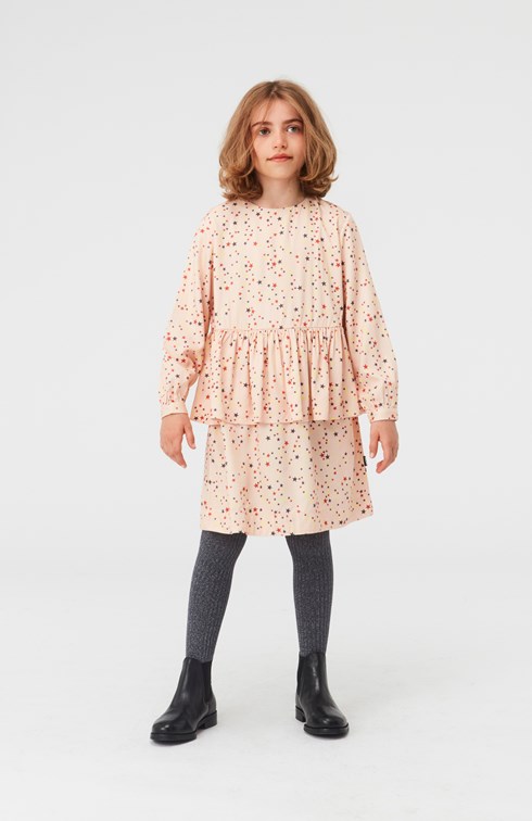 Charella er en lyserød kjole med stjerne print. Kjolen har peplum skørt og lynlås lukning i nakken.