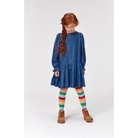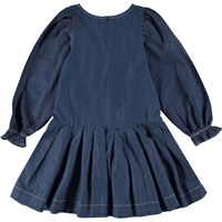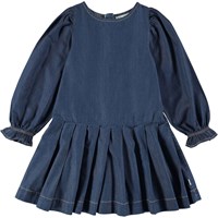 Charlize er en mørkeblå denim kjole med lange ærmer. Kjolen har volumiøse ærmer og et pliseret skørt. Kjolen har lynlås lukning i nakken.
