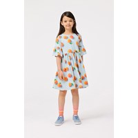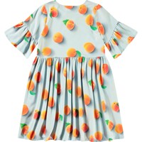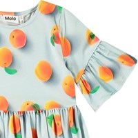 Lyseblå knælang kjole i blødt økologisk bomuldsjersey med rund hals og lange t-shirtærmer med flæse. Kjolen har et allover-print af solmodne abrikoser.