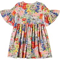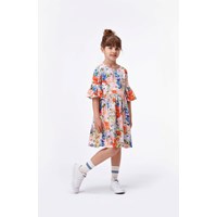 Chasity er en blå kjole med printet 'Hide and Seek', hvor forskellige dyr gemmer sig i blomster printet. Kjolen har volumiøse ærmer, som giver en flot silhuet til kjolen. Certificeret af Ecocert Greenlife, certifikationsnr. 197496.
