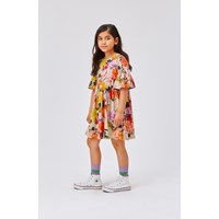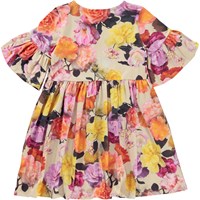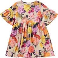 Chasity er en multifarvet kjole i økologisk bomulds jersey. Kjolen har et bredt stykke sat på bunden af ærmerne og et skørt med masser af vidde, der giver kjolen det dejligt luftigt udtryk. Kjolen er i et allover print med roser, der tager dig med igennem alle havens roser i alverdens farver.