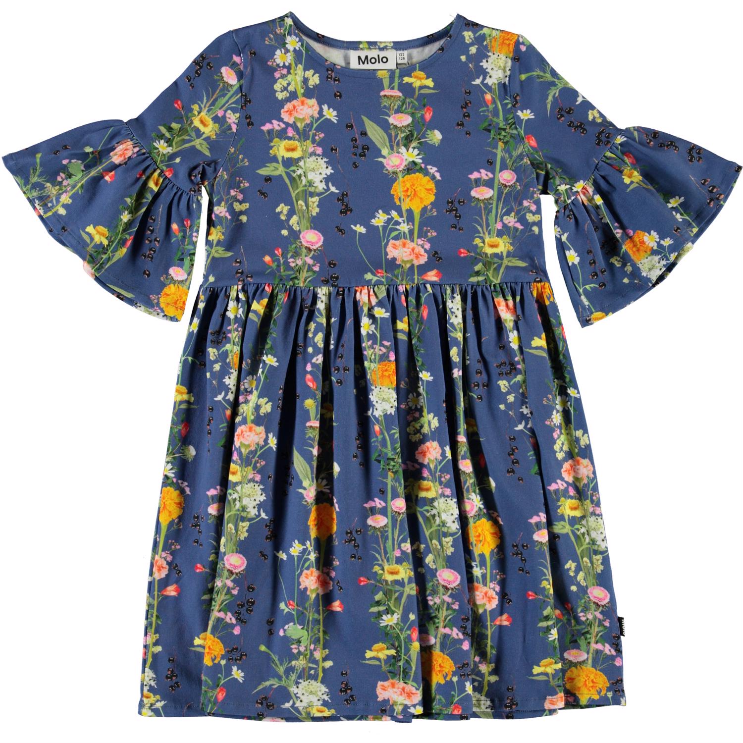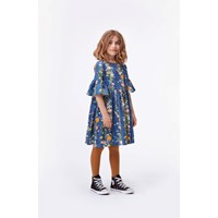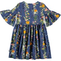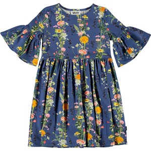 Chasity er en blå kjole med vertikale blomsterranker. Kjolen har volumiøse ærmer, som giver en flot silhuet til kjolen. Certificeret af Ecocert Greenlife, certifikationsnr. 197496.