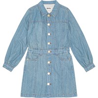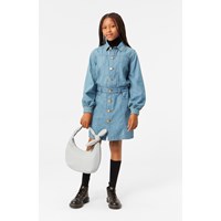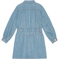 Lyseblå denim kjole i en let og blød bomuld med forlommer, lange ærmer med manchet og knaplukning, talje med bæltestropper og en indvendig justerbar elastik. Kjolen har gyldenbrune stikninger, der fremhæver de flotte detaljer og guldknapper som lukning.