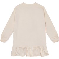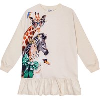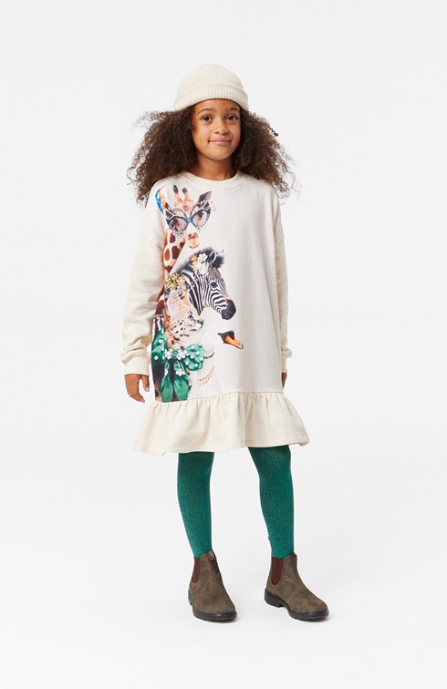 Råhvid jerseykjole i blød økologisk bomuld med et festligt print af forskellige dyr. Kjolen har en løs pasform, er knælang med en flæsekant i bunden og ribkanter ved hals og ærmer.