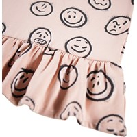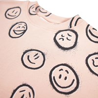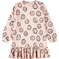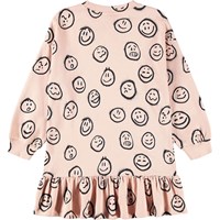 Lyserød sweatshirt kjole i blød økologisk bomuld. Kjolen har en løs pasform, er knælang med en flæsekant i bunden og ribkanter ved hals og ærmer. Kjolen har print af ansigter i forskelligt humør.