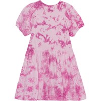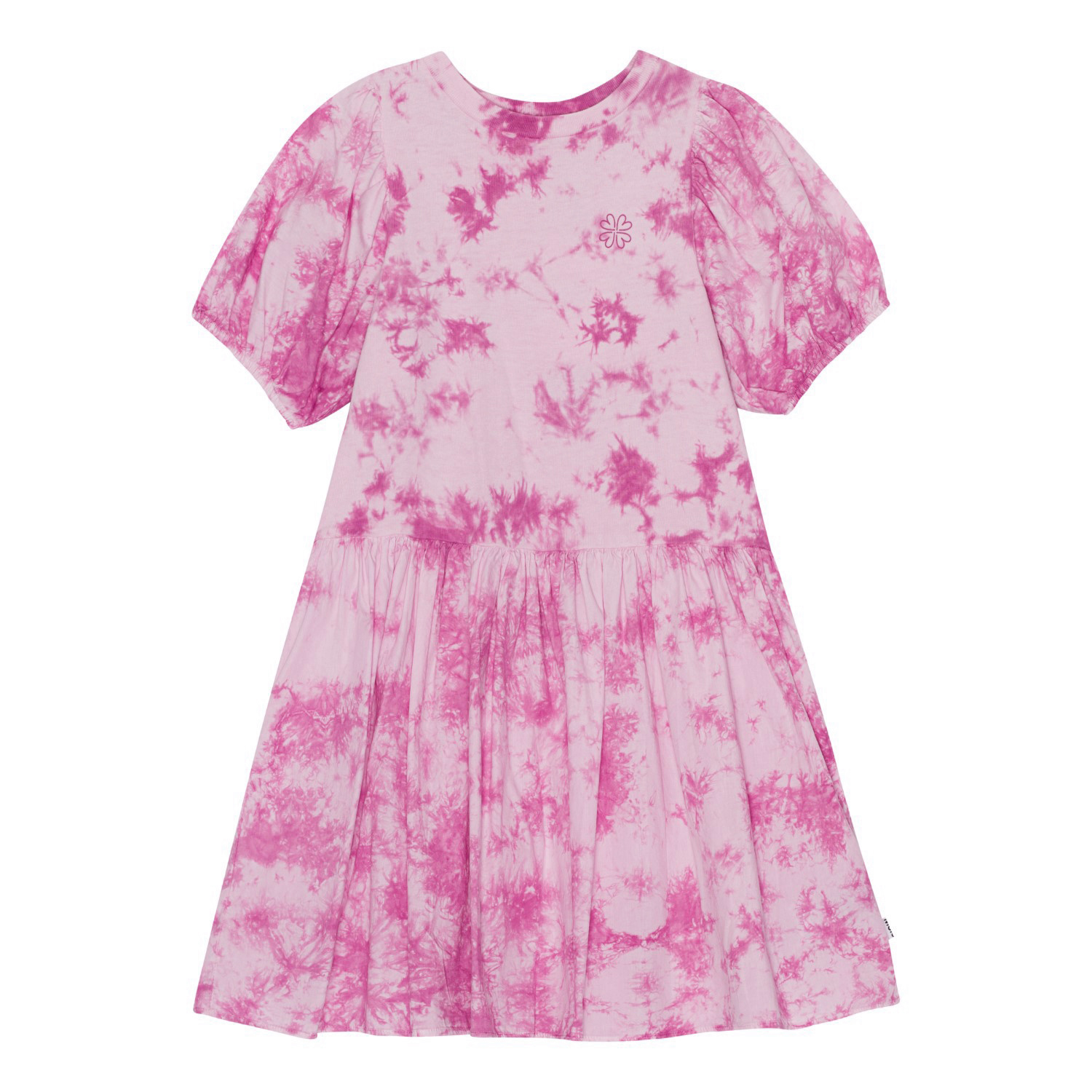 Lilla tie-dye kjole i økologisk bomuld med et lille print af en kløver ved brystet. Toppen er i blødt jersey med rund hals samt korte voluminøse ærmer med elastik i bunden. Skørtet rynkes ved hoften og har en flot volumen. Bemærk venligst at al vores tie-dye er håndlavet, hvilket skaber et unikt mønster der varierer fra style til style.