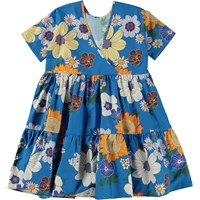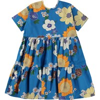 Blå knælang kjole med allover blomsterprint. Et simpelt grafisk print tegnet i hånden. Printet består af en masse forskellige blomster, som fx solsikker og geoginer, i orange og gule nuancer. Denne kjole er fremstillet i 100% bomuld, har en rund halsudskæring på fronten og en slå-om-detalje på ryggen, har korte ærmer, skørt med masser af volume og flæsedetaljer, samt et loose fit.