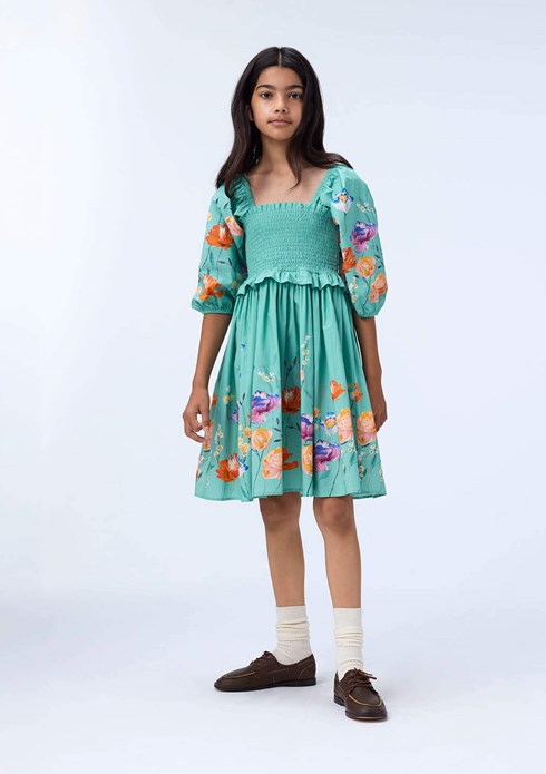 Grøn kjole i økologisk bolmuldspoplin. Kjolen har en firkantet halsudskæring, 3/4 længde ærmer med volumen og elastik, top med smock-effekt og skørt med masser af volumen. Ærmer og skørt er dekoreret med print af blomster.