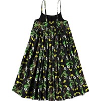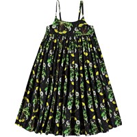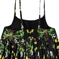 Sort knælang kjole i økologisk bomuld med smalle stropper. Kjolen har et fast bærestykke hen over brystet, smock-effekt i ryggen samt usynlig lynlås i siden, der gør den nem at komme af og i. Pasformen er løs med et allover-print af mælkebøtteplanter.