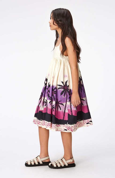 "Råhvid stropløs kjole i økologisk bomuld. Kjolen har et bærestykke over brystet og smalle stropper. Skæringen under brystet har masser af rynker og giver skørtet flot volumen. Kjolen er nem at tage på takket være den usynlige lynlås i sidesømmen. Kjolen har et print af en øde ø i sorte, lilla og pink nuancer, som giver associationer til en Hawaiiansk sommer.