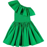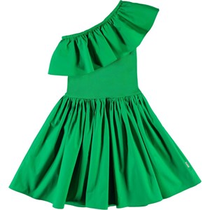 Chloey er en grøn drøm af en kjole. Kjolen er asymetrisk med flæsekant over det ene skulder. Overdelen af kjolen er i rib, mens skørtet er økologisk bomuld poplin, som har en flot volumen.