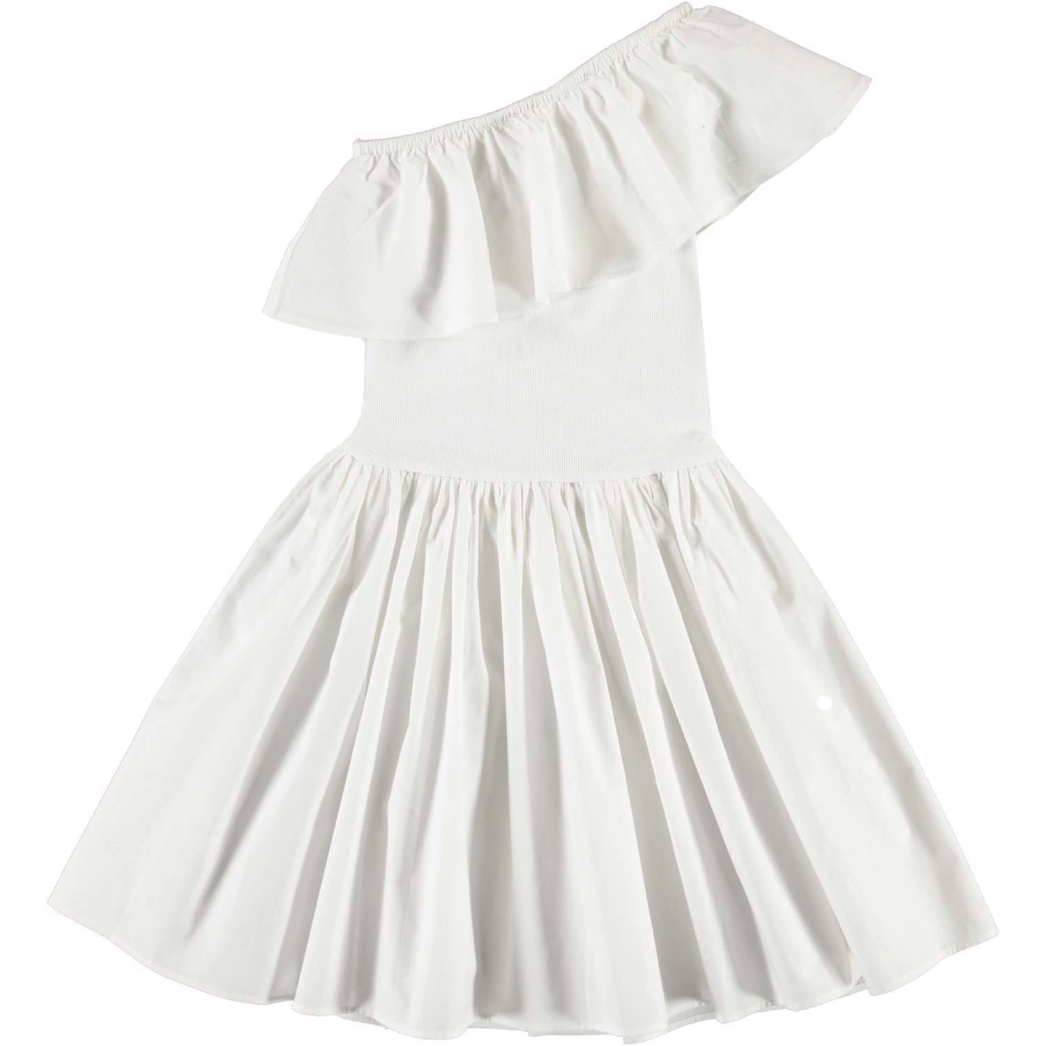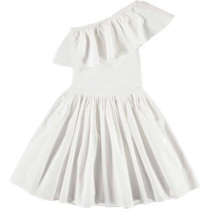 Chloey er en drøm af en hvid kjole. Kjolen er asymetrisk med flæsekant over det ene skulder. Overdelen af kjolen er i rib, mens skørtet er økologisk bomuld poplin, som har en flot volumen.