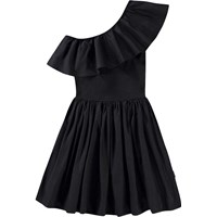 Sort one-shoulder kjole i blød økologisk bomuld med en tætsiddende, ribbet overdel og et knælangt, rundskåret skørt i let bomuldspoplin, der tilføjer volumen og bevægelse. Langs halsudskæringen løber en bred poplinflæse, som tilfører kjolen et legende og feminint udtryk.