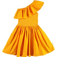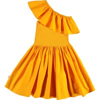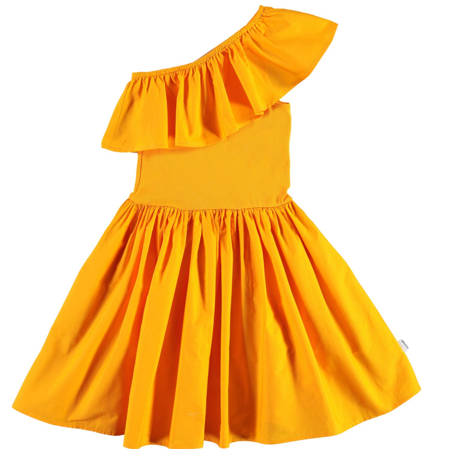 Chloey er en orange drøm af en kjole. Kjolen er asymetrisk med flæsekant over det ene skulder. Overdelen af kjolen er i rib, mens skørtet er økologisk bomuld poplin, som har en flot volumen.