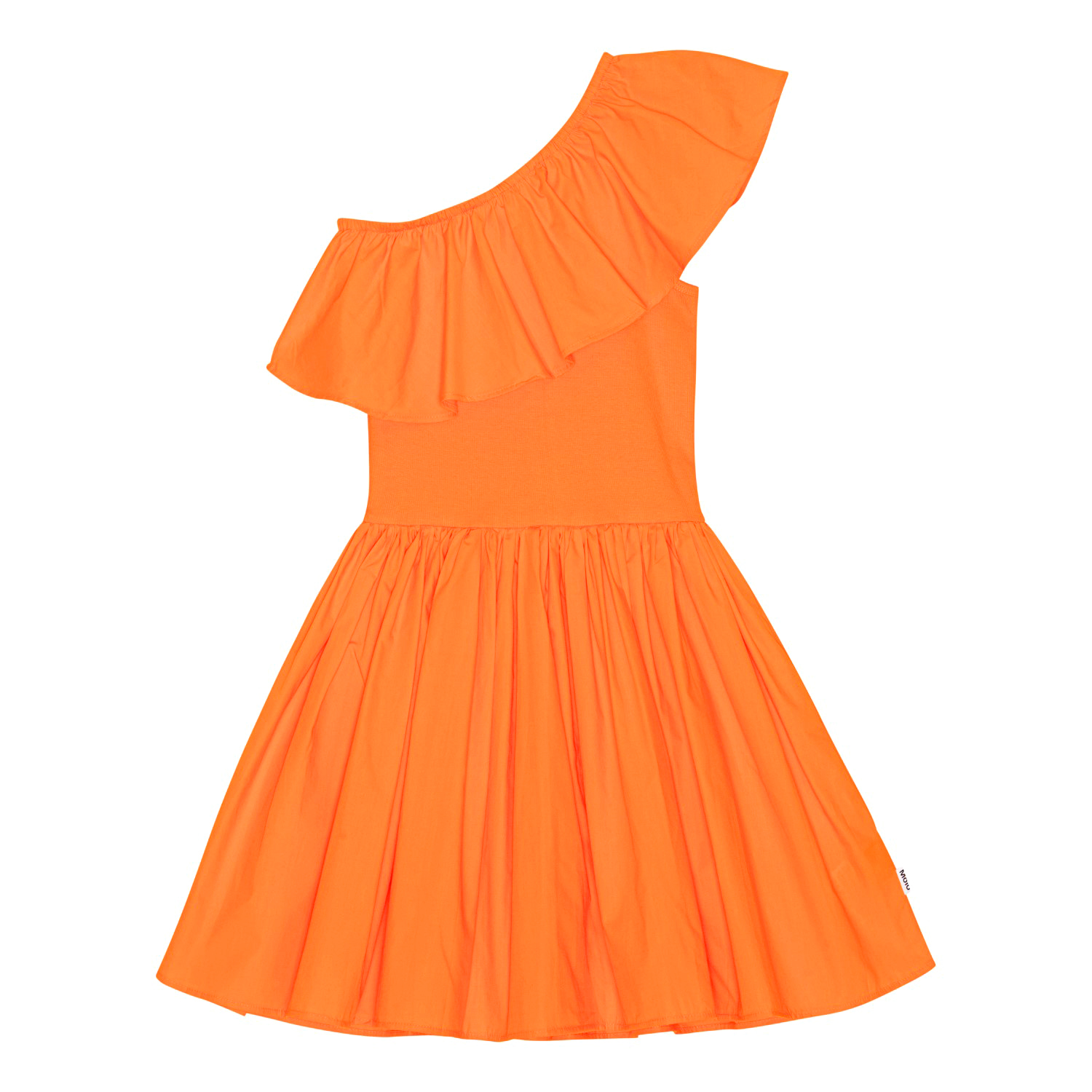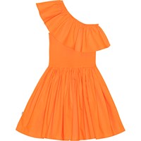 Orange one-shoulder kjole i økologisk bomuld. Kjolen har en bred poplin flæse langs halsudskæringen, en tætsiddende ribbet overdel samt en voluminøs underdel med et knælangt, rundskåret skørt.