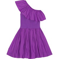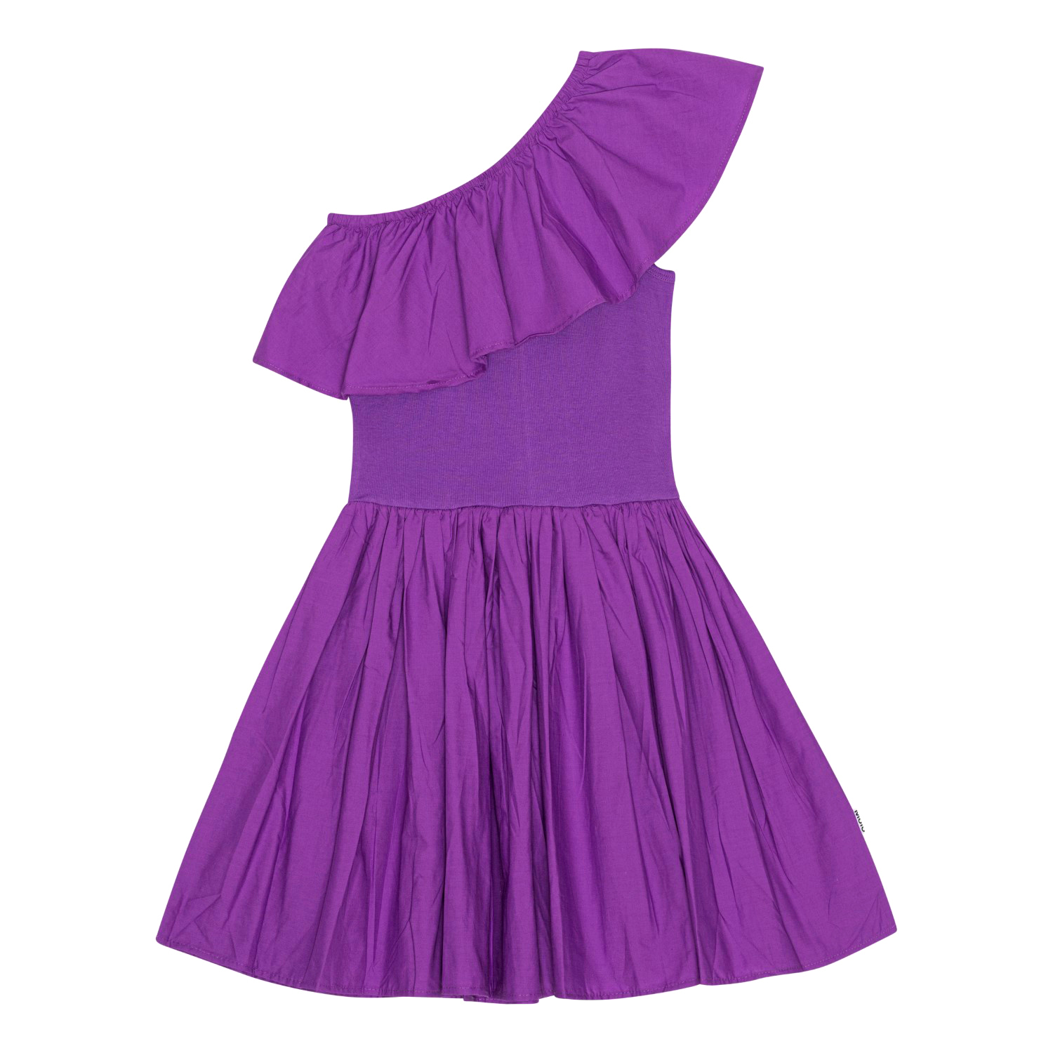 Lilla one-shoulder kjole i økologisk bomuld. Kjolen har en bred poplin flæse langs halsudskæringen, en tætsiddende ribbet overdel samt en voluminøs underdel med et knælangt, rundskåret skørt.