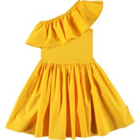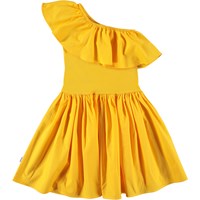 Chloey er en solgul 'one-shoulder' kjole med flæse og rundskåret skørt, i økologisk bomuld. På toppen er Chloey i ribbet jersey imed en flæse i bomulds poplin, mens skørtet ligeledes er i bomulds poplin. Skørtet er rynket i taljen, og dette giver en voluminøs effekt og masser plads til bevægelse. Smuk til både hverdag og fest.