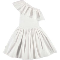 Chloey er en hvid 'one-shoulder' kjole med flæse og rundskåret skørt, i økologisk bomuld. På toppen er Chloey i ribbet jersey imed en flæse i bomulds poplin, mens skørtet ligeledes er i bomulds poplin. Skørtet er rynket i taljen, og dette giver en voluminøs effekt og masser plads til bevægelse. Smuk til både hverdag og fest.