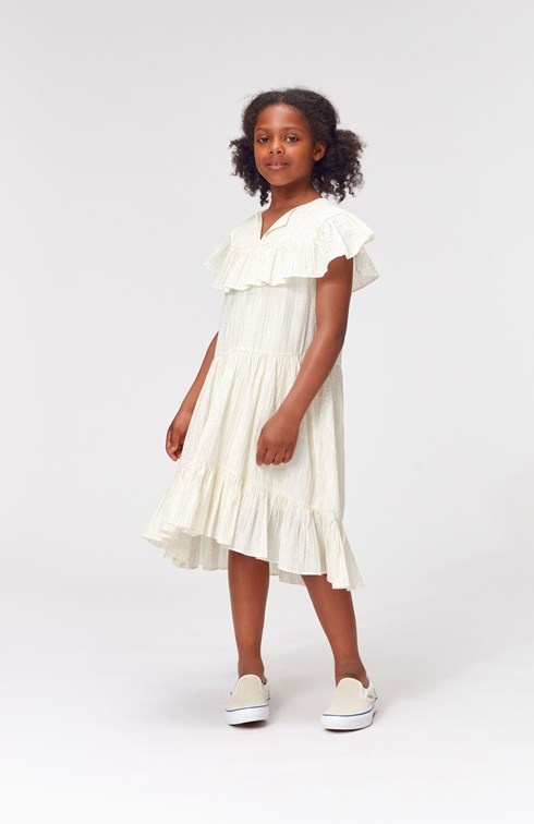 Cho er en hvid kjole med metallic striber. Kjolen har en flæse over brystet, som fortsætter op til skuldrene og udgør ærmerne. Desuden har kjolen et skørt med volume og flæse i bunden.