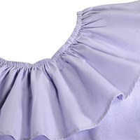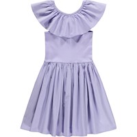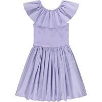 Lilla kjole i blød, økologisk bomuld med en tætsiddende, ribbet jerseytop og rund halsudskæring. Kjolen har et voluminøst, rundskåret skørt i let bomuldspoplin, der skaber en smuk kontrast til den enkle overdel. Toppen er ærmeløs og har en stor flæsekrave, der kan bæres både på skuldrene eller ud over skuldrene.