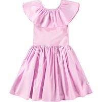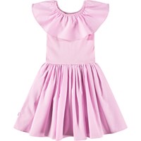 Lyserød knælang kjole i økologisk bomuld. Kjolens top er ærmeløs med en poplinkrave, der har elastik og kan bæres off-shoulder eller løftes op for at fungere som både krave og ærme. Kjolen har et voluminøst poplinskørt, der matcher kraven.