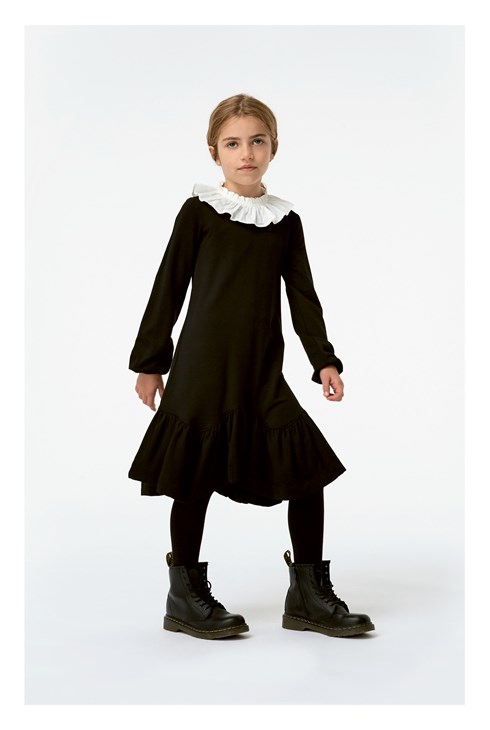 Christen er en sort langærmet kjole med asymetrisk underdel.