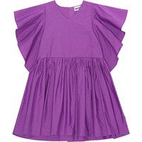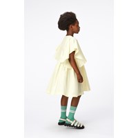 Pastel gul voluminøs kortærmet kjole i økologisk bomuld. Vide sommerfugleærmer, løstsiddende pasform og lynlås midt bag.