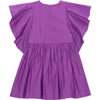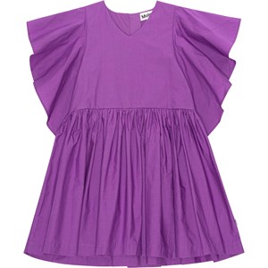 Lilla voluminøs kortærmet kjole i økologisk bomuld. Vide sommerfugleærmer, løstsiddende pasform og lynlås midt bag.