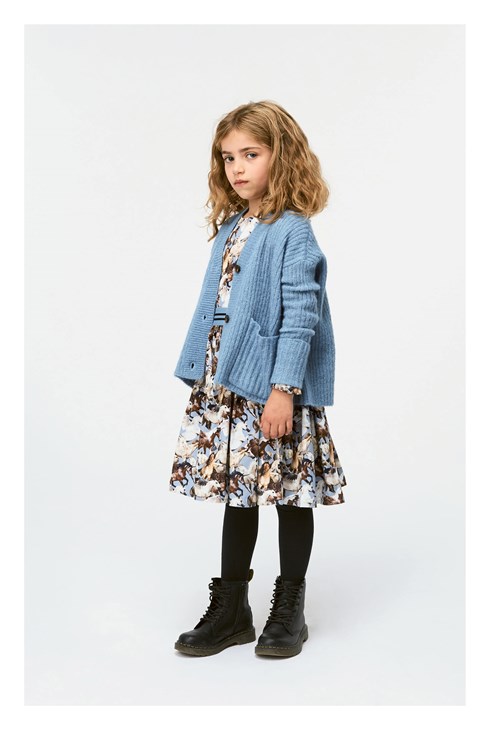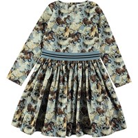 Christin er en poplin kjole med printet 'Celestial Unicorns'. Christin har lange ærmer, stribet bånd i taljen og lynlås lukning i nakken.